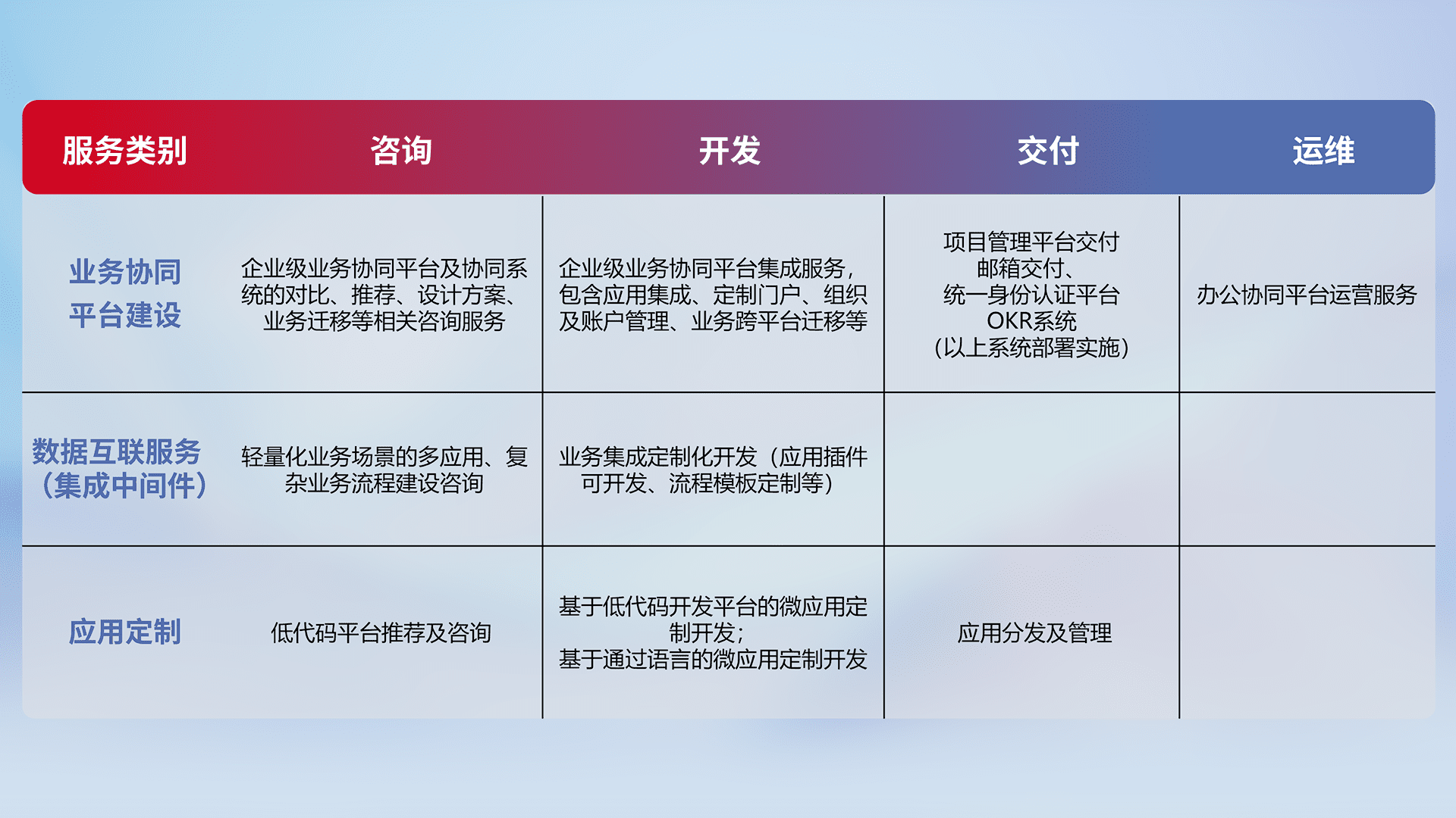 针对钉钉、、、、企微、、、IDaas等平台级产品提供产品的规划、、、方案、、交付、、、、定制化开发等服务,,,,实现如统一协同办公、、、、智能客户服务、、、、混合会议管理、、、智能数据查询、、等业务场景,,实现数字化转型。。。