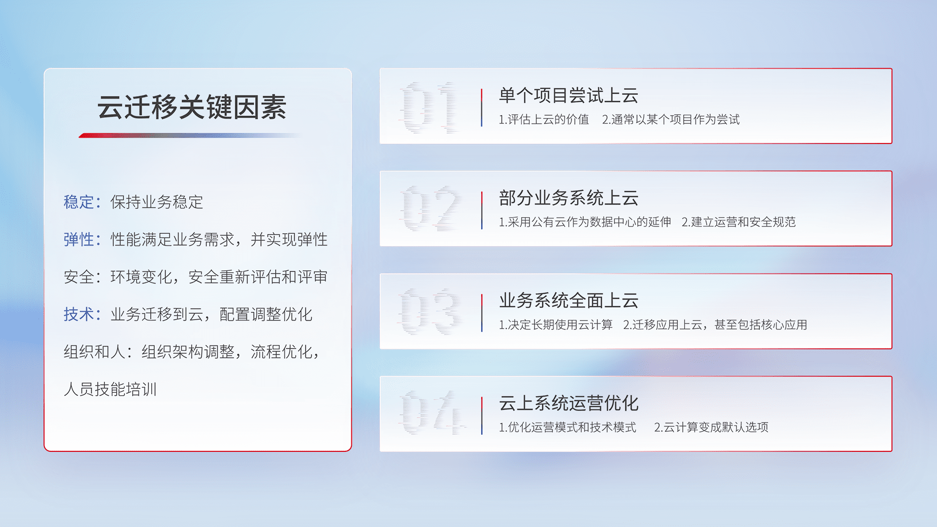 结合实际业务,,,从规划设计、、、、云平台选型、、、、云原生改造、、数据迁移、、、、集成交付,,迁移全过程为客户识别最佳上云路径,,做好风险识别管理,,设计网络架构、、、身份权限、、、、安全审计合规、、、、操作审计、、、、日志审计、、、监控告警策略、、、多站点容灾设计等,,,,对云上基础设施进行整体规划,,,,提升IT治理水平,,,以满足弹性、、、、高可用、、、、高性能的需求。。