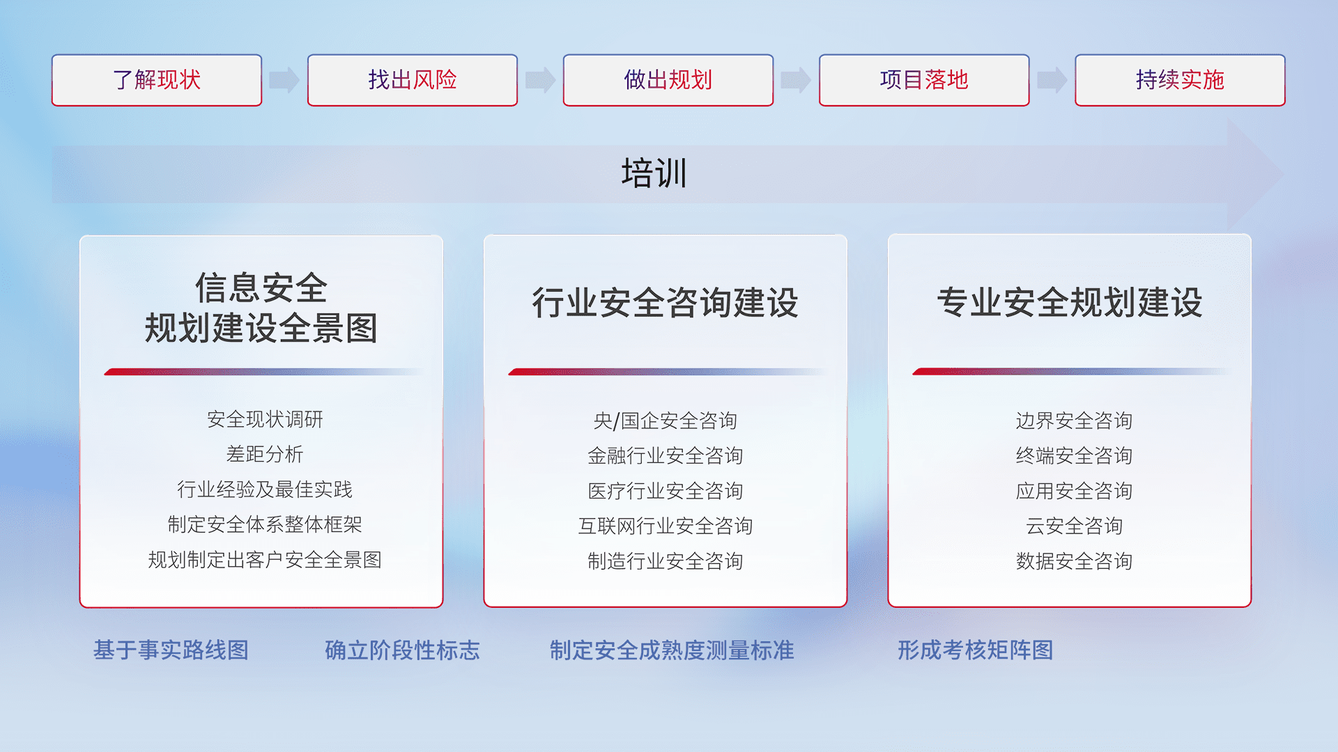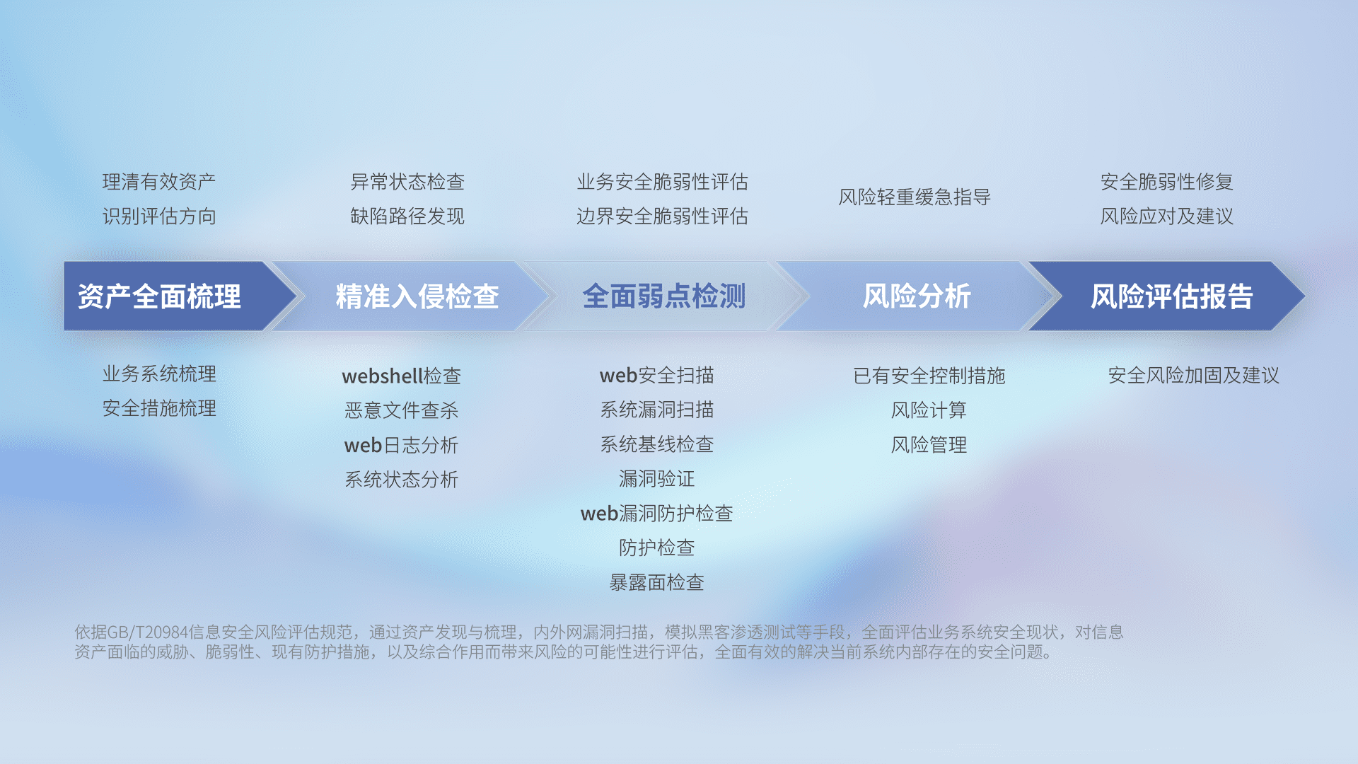 针对客户行业特性,,,,以专业的安全服务+多厂商联合解决方案提供专属的一站式安全管理服务,,帮助客户全面感知网络空间威胁,,,,基于识别、、、检测、、分析、、、、防护、、监测、、、响应的服务理论模型,,从方案咨询、、集成交付、、、、评估验证、、、优化加固、、运维运营,,致力于为客户提供完整的闭环管理式安全服务。。。。以实战经验为客户打造高抵御风险的安全体系,,,,帮助客户发现威胁、、、对抗威胁、、处置威胁,,不断积累安全对抗能力,,,持续保障数字化安全。。。